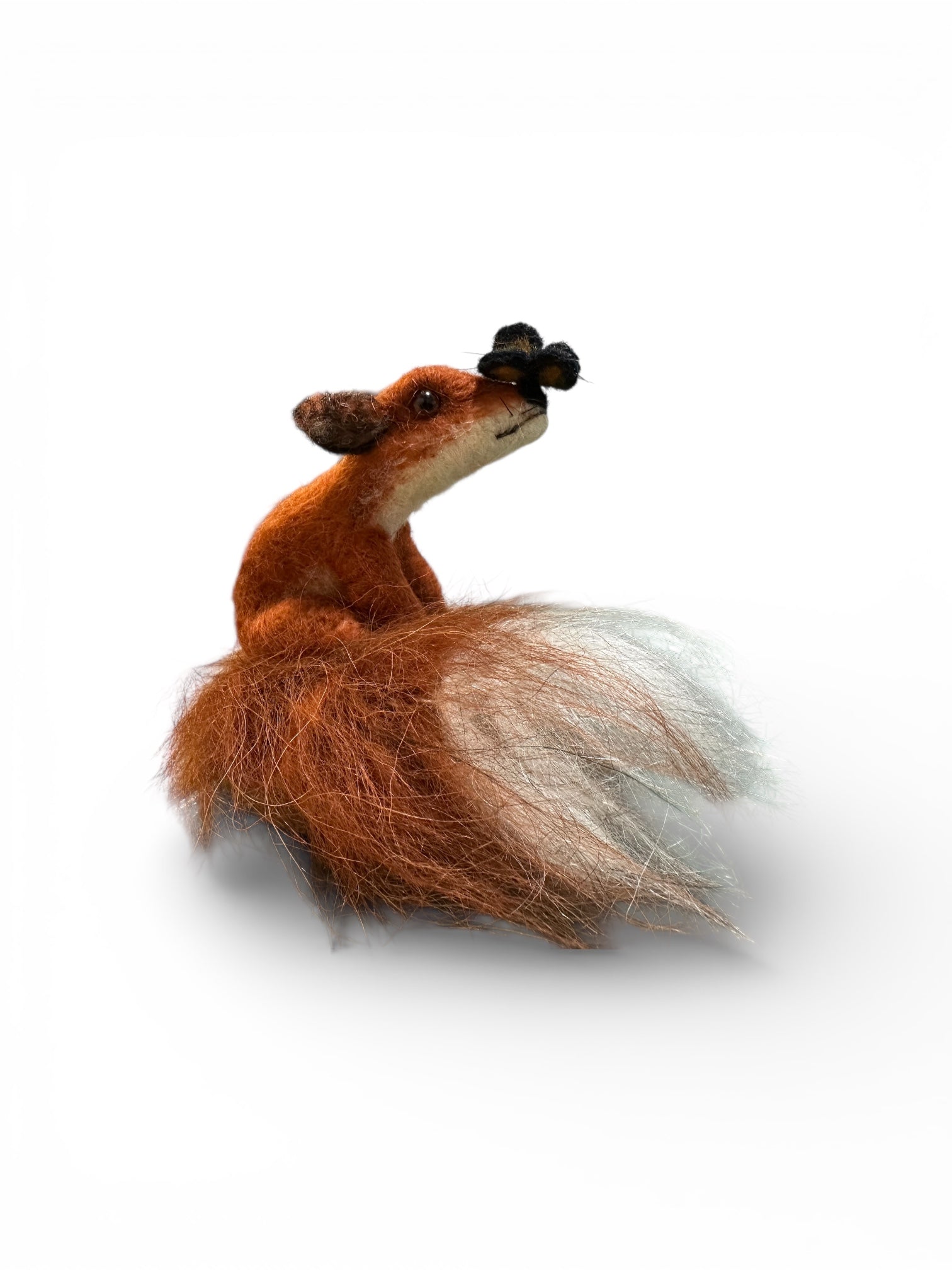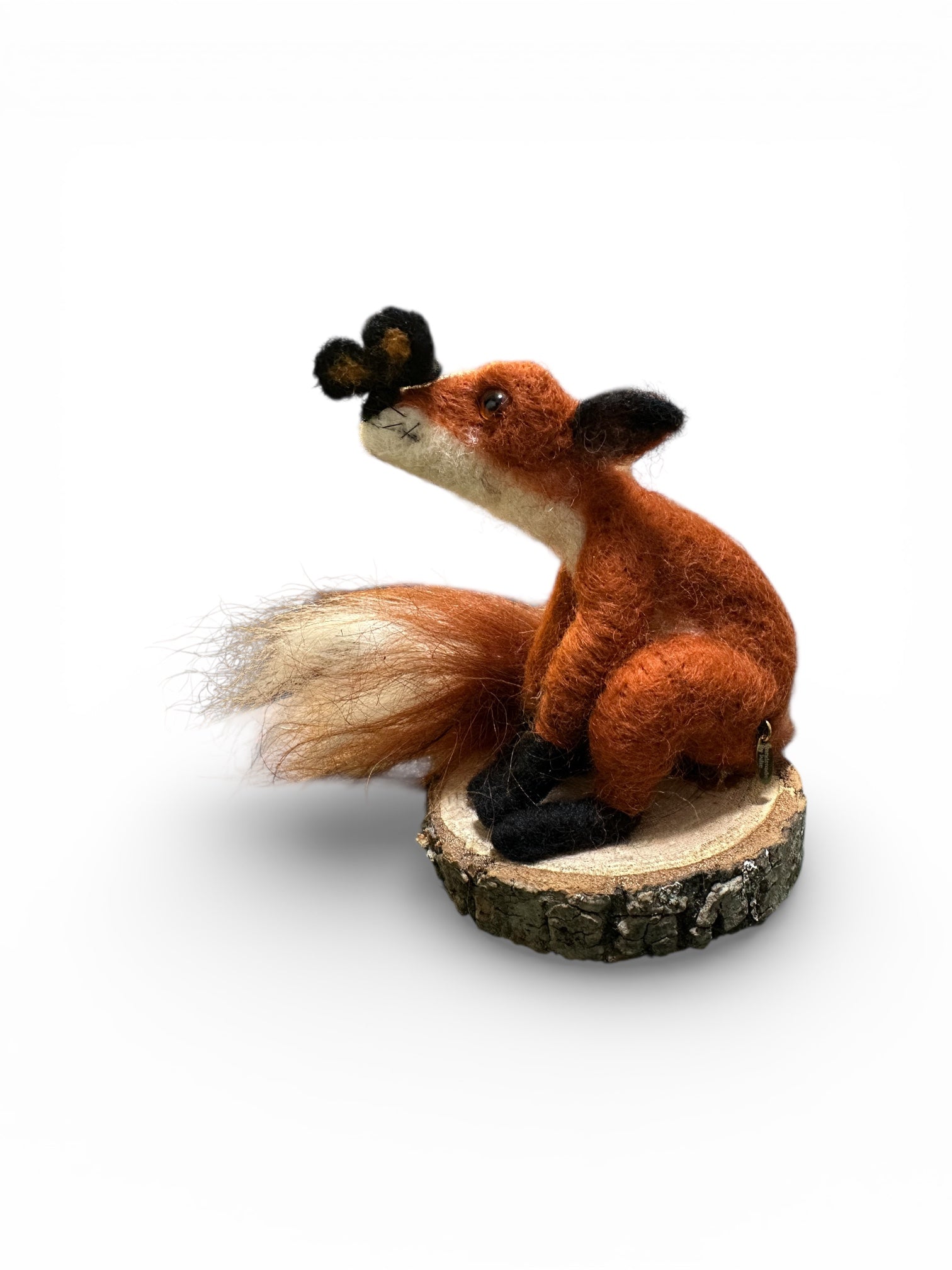 Julie Daniel Richards turns raw fibre into a totem of wisdom. Through the focused process of needle felting, she has created a Red Fox, sculpted with incredible detail, resting upon a natural wood slice.